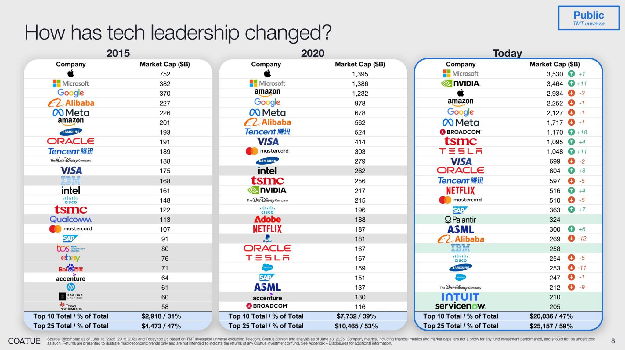 會議首先揭示科技巨頭市值排名自 2015 至 2025 年的劇烈變遷:從 Apple 獨大與 IBM、Intel、Cisco 等傳統勢力占位,到 NVIDIA 躍升前三、Apple 退居第三,TSMC、Broadcom、Tesla 等新星進入前十。這不僅是名次洗牌,更反映科技核心從消費平台轉向 AI 硬體與半導體基礎建設,資本集中度迅速升高,市場資源加速流向能承接 AI 浪潮的基礎供應商。