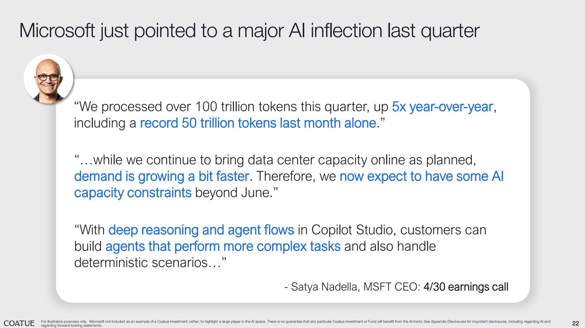 微軟 CEO 納德拉指出,微軟本季處理超過 100 兆 tokens,並面臨容量限制,反映 AI 進入工業化階段,對電力與基礎設施的依賴與日俱增,強化電力與半導體供應商的戰略地位。